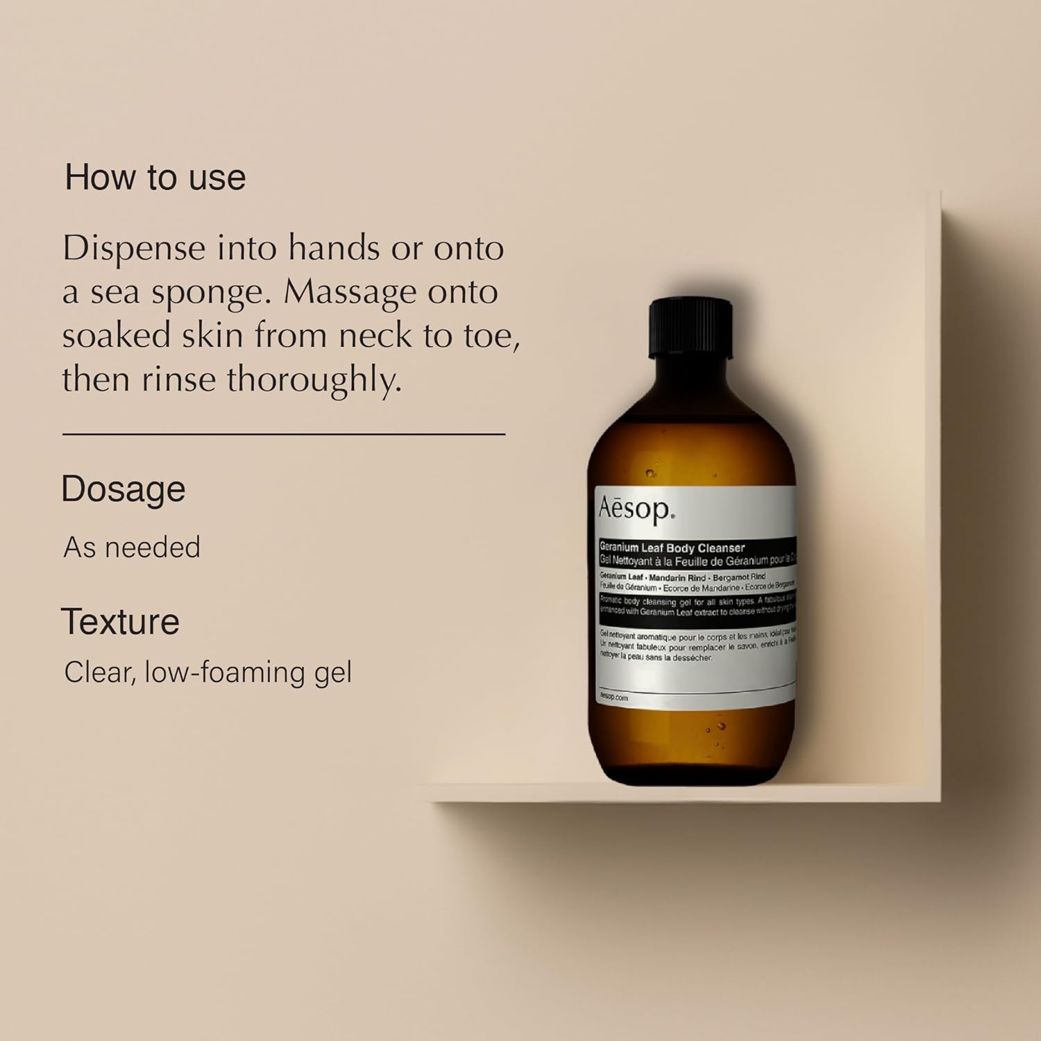 - How to use: Dispense into hands or onto a sea sponge. Massage onto soaked skin from neck to toe. then rinse thoroughly.